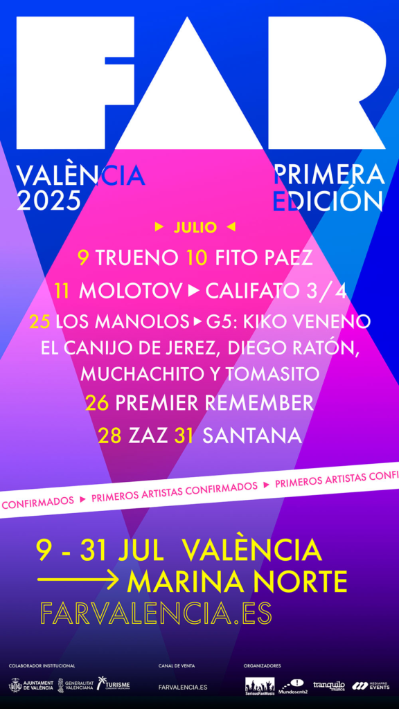 A partir del 9 de julio, un nuevo ciclo de conciertos llenará de luz las noches de la ciudad de València al ritmo de numerosos grupos y cantantes nacionales e internacionales: FAR València. Con la producción de Serious Fan Music, Mundosenti2 & Mediapro Events (GRUP MEDIAPRO) y Tranquilo Música, esta nueva cita recogerá una gran variedad de estilos para un extenso abanico de aficionados a la música.