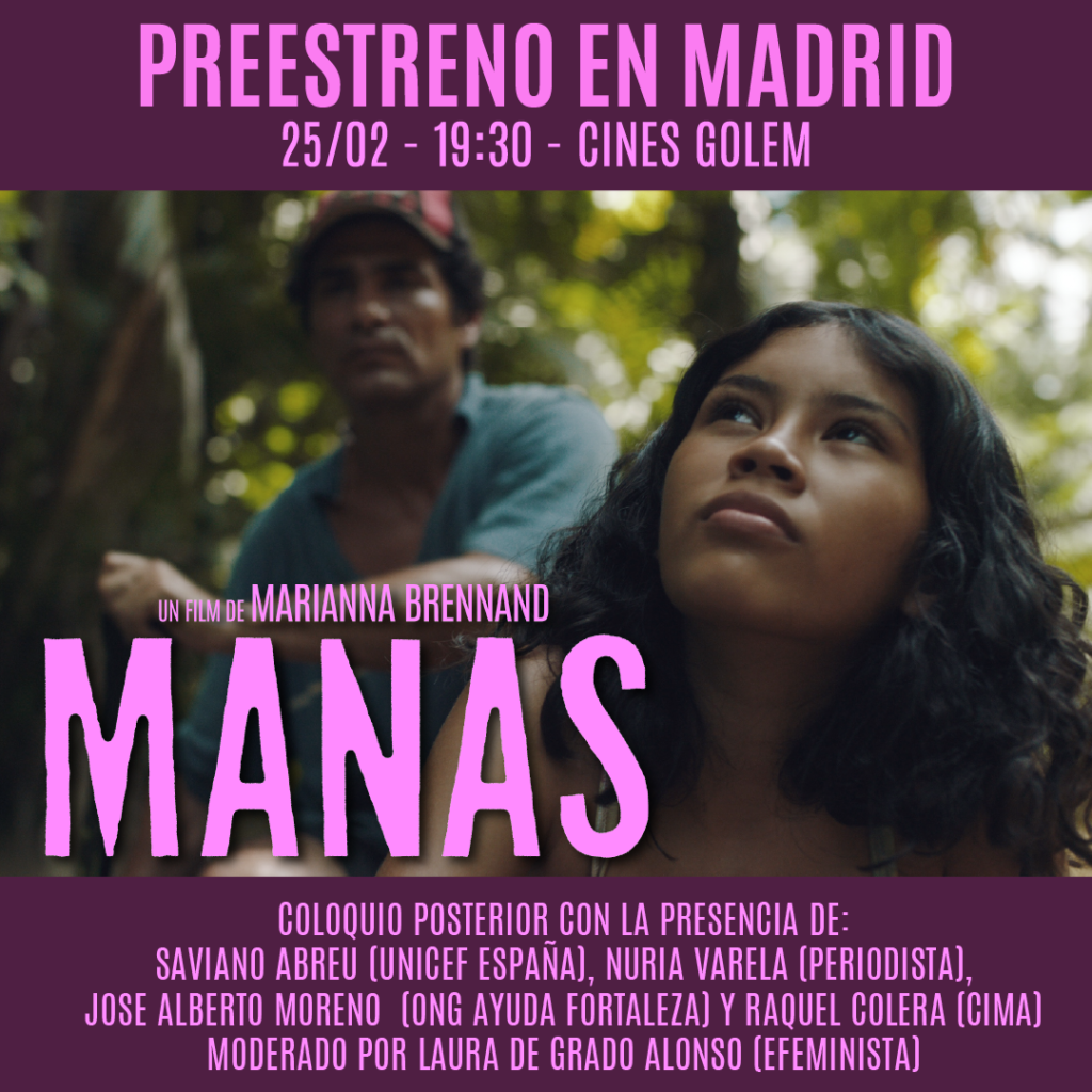 Los Cines Golem de Madrid acogerán el próximo miércoles 25 de febrero a las 19:30 horas el preestreno especial de Manas, la película de Marianna Brennand nominada a los Premios Goya como Mejor película iberoamericana. La proyección estará seguida de un coloquio con representantes de Unicef, Ayuda Fortaleza y CIMA, junto a la periodista y activista Nuria Varela, moderado por la periodista Laura de Grado Alonso, de EFEminista.