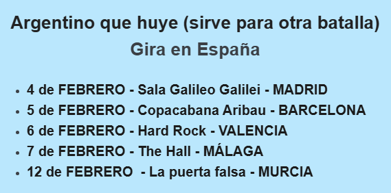 “Argentino que huye (sirve para otra batalla)” se presenta el próximo el miércoles 4 de febrero en la sala Galileo Galilei de Madrid, el 5 de febrero en el Copacabana Aribau de Barcelona, el 6 de febrero en el Hard Rock de Valencia, el 7 de febrero en The Hall en Málaga y el 12 de febrero en La puerta falsa en Murcia.