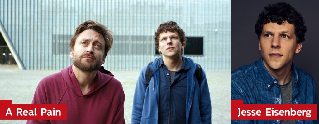El actor Jesse Eisenberg (La red social) presenta su segunda película como director, A Real Pain, que protagoniza junto a un extraordinario elenco en el que figuran Kieran Culkin (Sucession), Jennifer Grey (Dirty Dancing) o Will Sharpe (The White Lotus). A Real Pain, cuyo guion fue premiado en Sundance, parte de la experiencia personal de Eisenberg.
