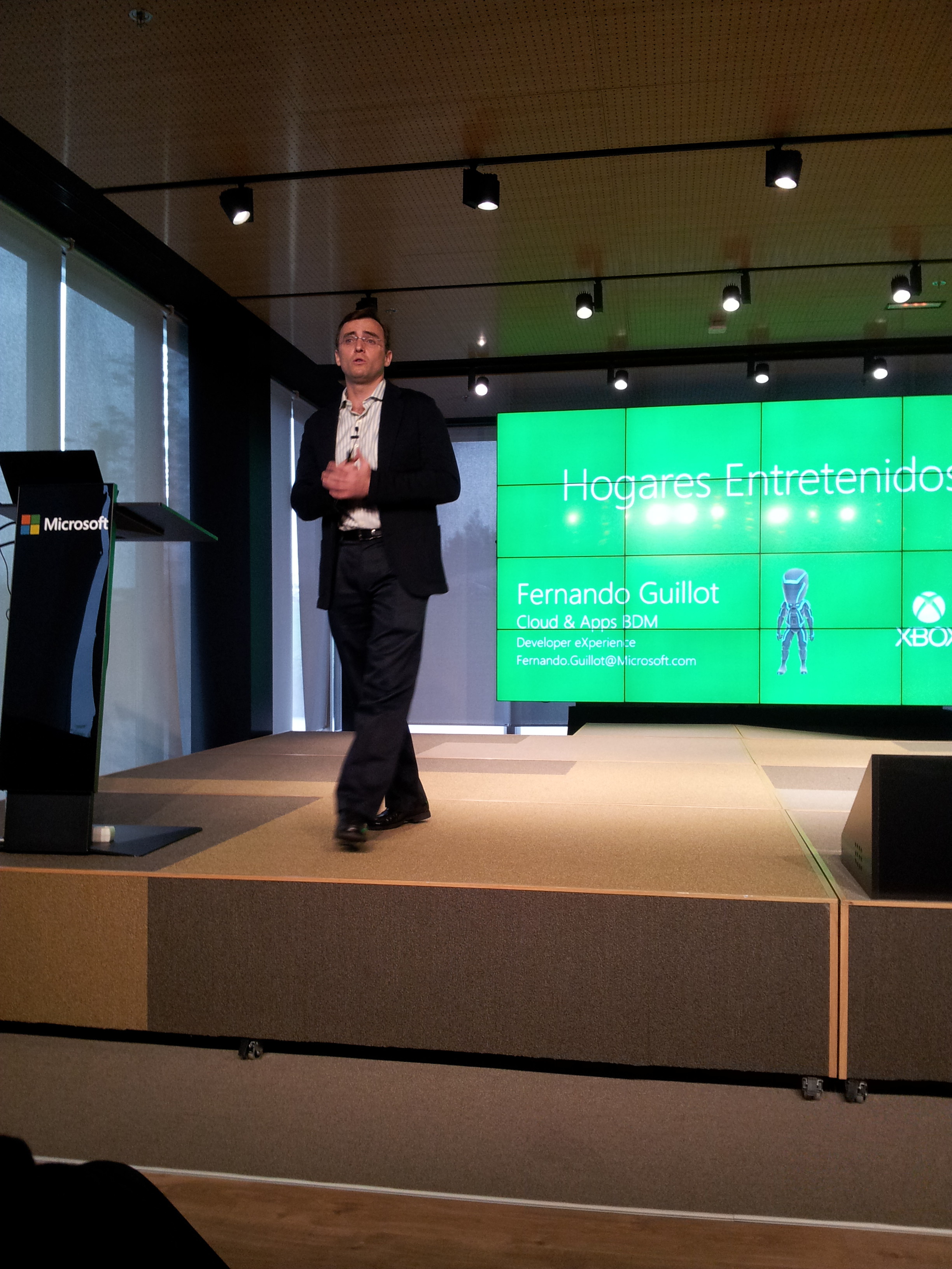 Por último Fernando Guillot, BDM Cloud & Apps de Microsoft, presentó Hogares entretenidos. Videojuegos y más allá, dónde se expuso como será y como se usará en los hogares la XBOX. El desarrollo de la consola hace que ya no solo se use para jugar, también se usa y se podrá usar para ver la televisión, películas, navegar por la web e incluso para estar conectado con más gente. Además durante la ponencia se dio un avance de lo que será Windows 10, un nuevo sistema donde todos las plataformas se unan.