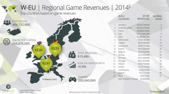 El mercado de videojuegos en Europa supone en 2014 un 22% de los ingresos totales del sector del videojuego a nivel mundial. Un año más, los cinco países europeos que más ingresos aportan al sector son Alemania, España, Francia, Italia y Reino Unido.