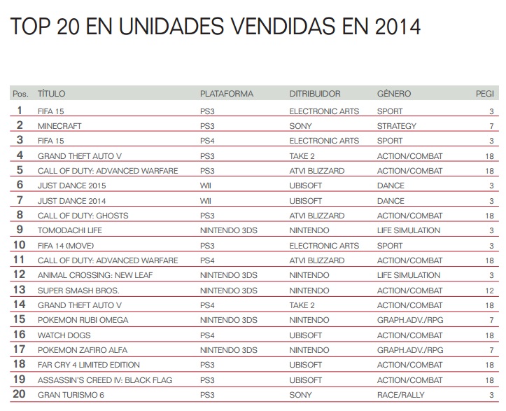 FIFA 15, uno de los lanzamientos de 2014, se posiciona doblemente en el podio de los videojuegos más vendidos. Le sigue Minecraft y la saga que lideró el top 20 de ventas de 2013, Grand Theft Auto V. Los juegos colaborativos, como Just Dance, siguen siendo una de las opciones preferidas de los gamers españoles. Con respecto a sus géneros predilectos y las sagas comerciales más exitosas, la tendencia es similar a la de 2013. La principal novedad de la tabla la encontramos en el puesto nueve con la irrupción del título de simulación real, TOMODACHI LIFE.
