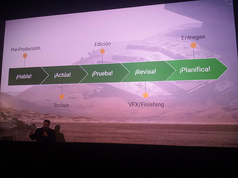 Su experiencia en dicho film y su conferencia se aplicaba a cualquier tipo de producción, grande o pequeña. Para Juan Ignacio, la clave de una buena post producción comienza en la fase de pre-producción, que pocas compañías hacen y deberían hacer. Un ejemplo: la búsqueda de entornos o localizaciones con la ayuda del supervisor de VFX puede prever y ahorrar costosos procesos de post-producción. Del mismo modo, el trabajo diario y etalonaje de los dailies con el equipo de colorización en constante contacto con el equipo de arte y el director del proyecto puede llegar a decantar las siguientes fases de grabación en búsqueda de nuevas soluciones creativas que hasta el momento de la grabación no se habían concebido.
