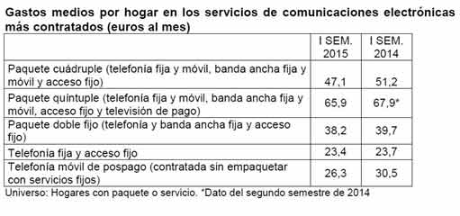 Los gastos medios por hogar en los paquetes y servicios de telecomunicaciones más contratados disminuyeron. El que más descendió fue el gasto en telefonía móvil de pospago de los hogares que no contratan servicios fijos y móviles empaquetados, cuyo importe cayó unos cuatro euros al mes desde principios de 2014. También el gasto en paquete cuádruple presenta un importante descenso interanual, del 8%.