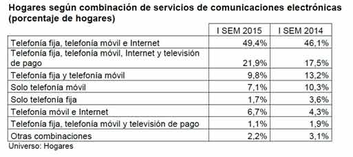 Un 49,4% de los hogares disfrutó de servicios de telefonía fija, telefonía móvil e Internet, que es la combinación de servicios más popular entre los hogares españoles. En segundo lugar, un 21,9% de los hogares añade a los anteriores servicios la televisión de pago. El resto de combinaciones de servicios alcanzan porcentajes bastante menores que, además, descendieron sustancialmente, con la excepción de los hogares con telefonía móvil e internet. Es notorio, por ejemplo, el descenso de los distintos tipos de hogares que solo disponen de telefonía (sea fija, móvil u ambas).