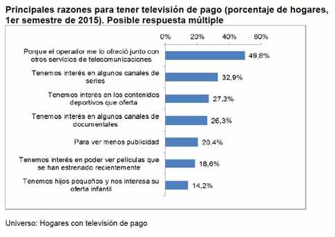 El tipo de hogares que más crece, en términos absolutos, es el que cuenta con telefonía fija, telefonía móvil, Internet y televisión de pago, como resultado de la venta conjunta de estos servicios a precios más favorables para el consumidor. Así, según los hogares con televisión de pago, el principal motivo para la contratación del servicio fue que su operador de telecomunicaciones les hizo una oferta que incorporaba la televisión de pago al resto de servicios de telecomunicaciones contratados. Otros atractivos destacados en la contratación de la televisión de pago son las series y los contenidos deportivos.