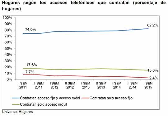 La gran mayoría de hogares españoles (un 82,2%) contrata tanto accesos telefónicos fijos como móviles, mientras que los hogares con un único tipo de acceso caen paulatinamente. No obstante, todavía persiste un 15% de los hogares que solamente disponen de teléfono móvil. Entre los motivos de estos hogares para no disponer de teléfono fijo destacan: es más económico disponer únicamente de acceso móvil (46,3%) y no querer confrontar pagos fijos al mes, (34,6%).