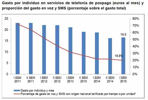 El gasto por individuo y mes en servicios de telefonía de pospago fue de 16,5 euros al mes, inferior al de inicios de 2014 (18,8 euros al mes) pero ligeramente superior al de finales de 2014 (16,2 euros mensuales). Tan sólo una quinta parte de este importe se originó en servicios de voz y mensajería con origen nacional.