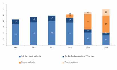 El 64,3 por ciento de las líneas de telefonía fija y casi el 95 por ciento de las de banda ancha fija estaban empaquetadas. En cuanto a la televisión de pago, algo más del 6 por ciento de
