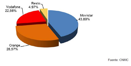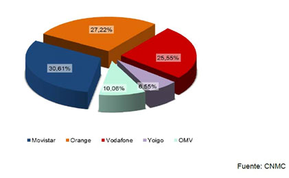 Respecto a la cuota de mercado por líneas de banda ancha fija, el 95% de las líneas de banda ancha fija se concentra en los tres principales operadores, Movistar, Orange (incluido Jazztel) y Vodafone (incluido Ono).