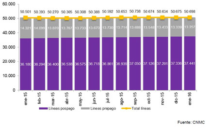 El parque de líneas móviles ganó en enero 23.032 líneas. El incremento registrado en pospago de 104.935 compensó la bajada de prepago, con 81.903líneas menos. El mes cerró con una cifra de 50.697.889 líneas móviles, lo que supone un 0,4% más que en enero de 2015.