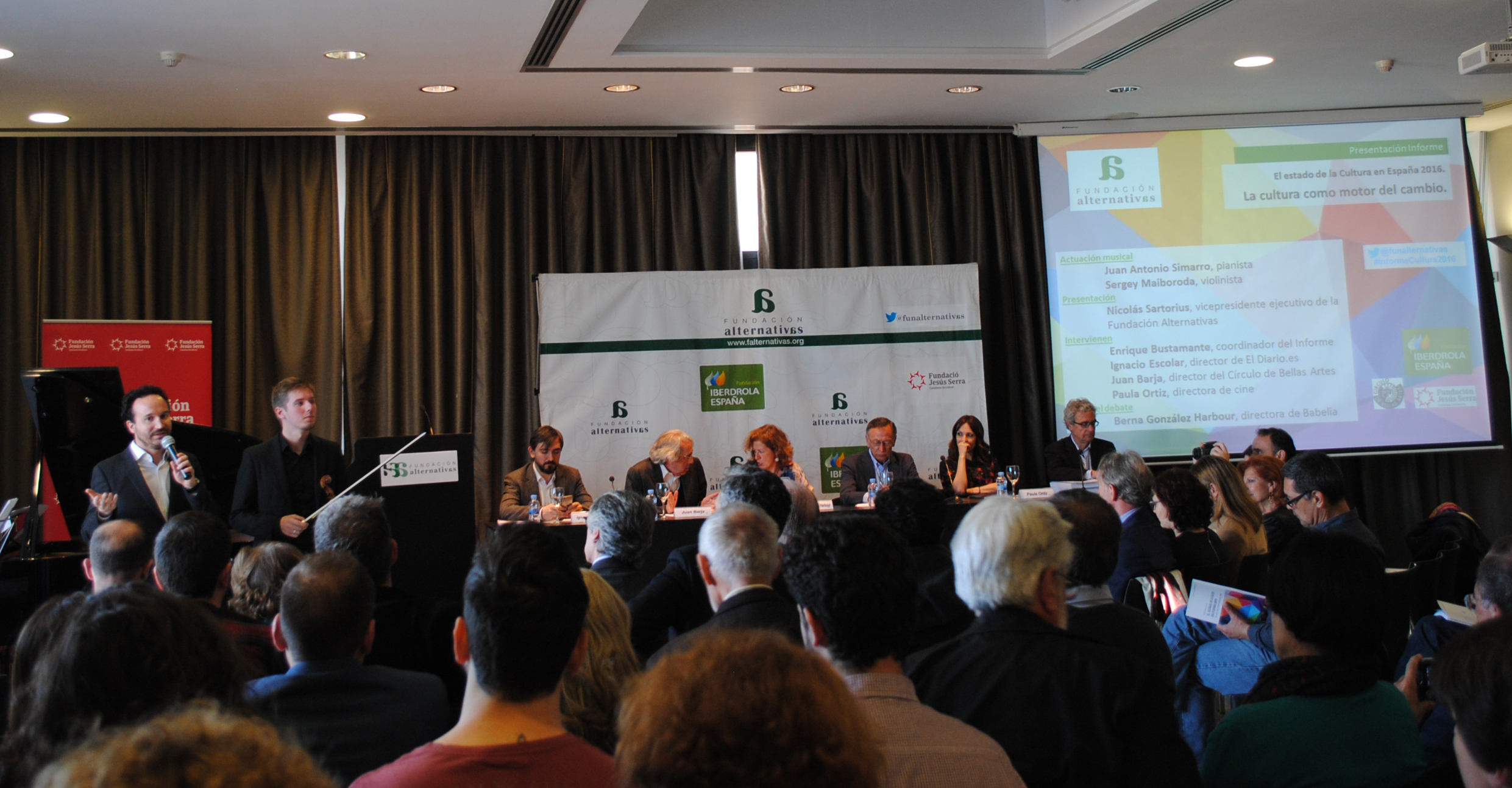 La presentación comenzó con la actuación musical del pianista Juan Antonio Simarro y el violinista Sergey Maiboroda, quienes dieron paso a las palabras de inauguración a cargo de Nicolás Sartorius, quien ha insistido en la necesidad de incentivar la Cultura para mejorar como sociedad global. “Que centenares de personas mueran en el mundo a causa del terrorismo, por ejemplo, es una muestra de incultura terrible y es que debemos de reconocer que en España, en Europa y en el mundo entero, hay un déficit de Cultura y un superávit de crueldad y la única solución es afianzar la Cultura, que es el fundamento de la cohesión social. El conocimiento es la base de la libertad individual y de la democracia colectiva, por eso, debemos colocar a la Cultura en el centro de la política para lograr el cambio que tanto necesitamos y pedimos a voces”, ha expresado Sartorius.
