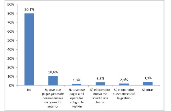 Entre los usuarios que realizaron una portabilidad (cambio de proveedor), un 80 por ciento no tuvieron que realizar ningún pago asociado a este trámite. Entre los que tuvieron que realizar un desembolso de dinero, la principal razón fue liquidar la cláusula de permanencia que existía en su contrato (en un 10,6 por ciento de los casos).