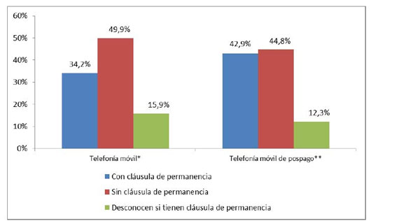 Por otra parte, la cláusula de permanencia está muy presente en los servicios móviles, principalmente en los contratos de pospago. Así, un 43 por ciento de los usuarios afirmaron tener un contrato sujeto a una cláusula de permanencia, porcentaje similar al caso de las telecomunicaciones fijas, que alcanza el 46 por ciento.