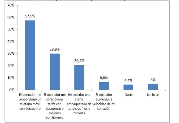 El informe de la CNMC señala que 6 de cada 10 usuarios, reconocieron tener cláusula de permanencia motivada por un descuento en la adquisición de un teléfono móvil, mientras que 3 de cada 10 afirmaron que consiguieron así mejores condiciones o tarifas más ventajosas.
