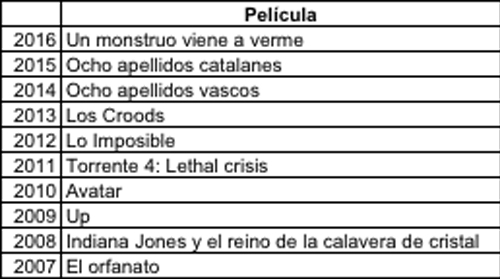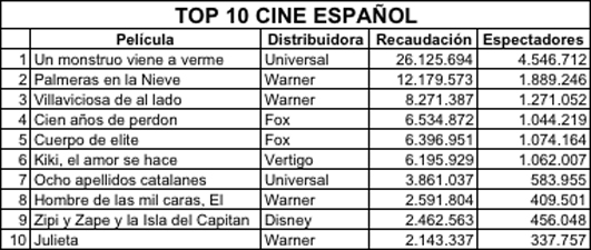 En cuanto al ranking de películas españolas más vistas del año, junto a Un Monstruo viene a verme, Palmeras en la nieve y Villaviciosa de al lado cierran el pódium del año 2016.