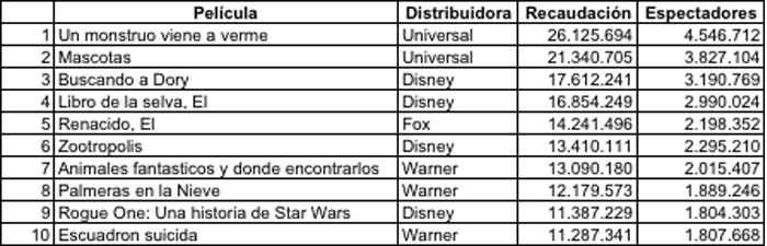 La última película de J.A Bayona, Un Monstruo viene a verme lidera la taquilla del 2016 con más de 26 millones de euros de recaudación y más de 4,5 millones de espectadores.