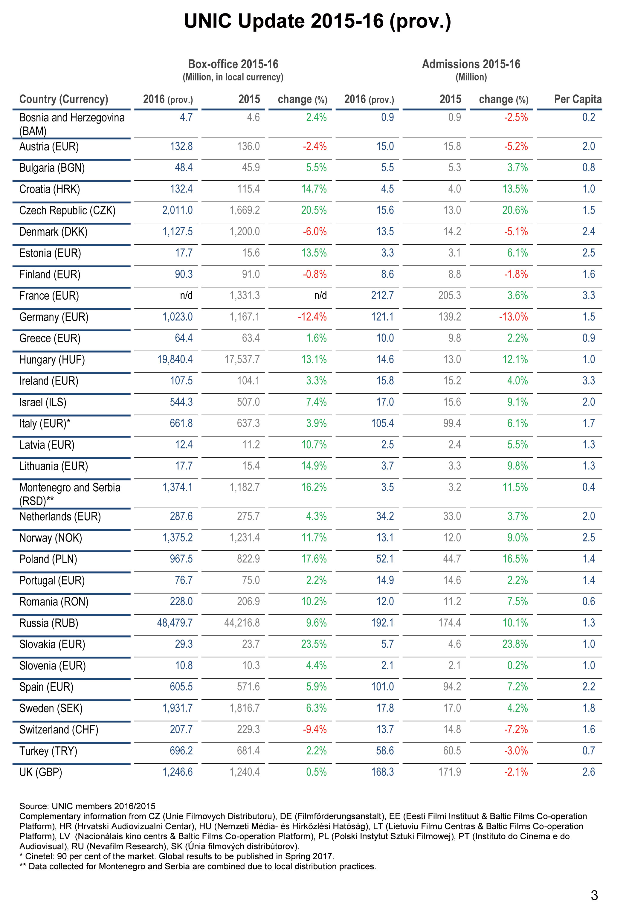De acuerdo con los datos provisionales de UNIC, el número de espectadores franceses registró un aumento del 3,6 por ciento sobre 2015, obteniendo su segundo mejor dato de los últimos 50 años. Del mismo modo, Rusia también consiguió resultados muy positivos, con aumentos del 9,6 por ciento en su taquilla y del 10,1 por ciento en espectadores, ratificándose como el segundo territorio más importante de la UNIC, con más de 190 millones de entradas.