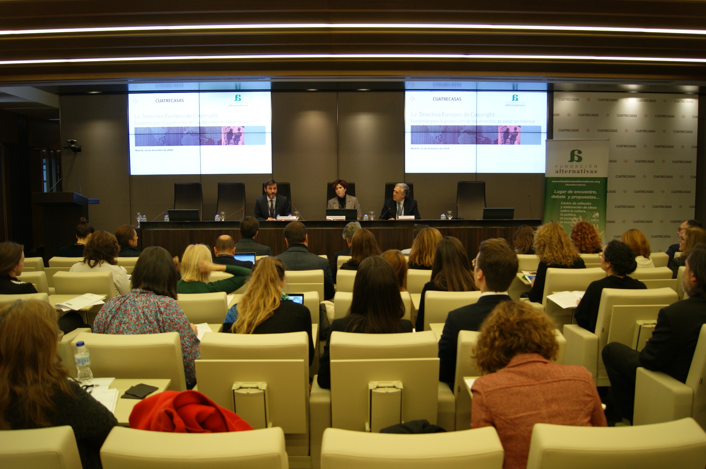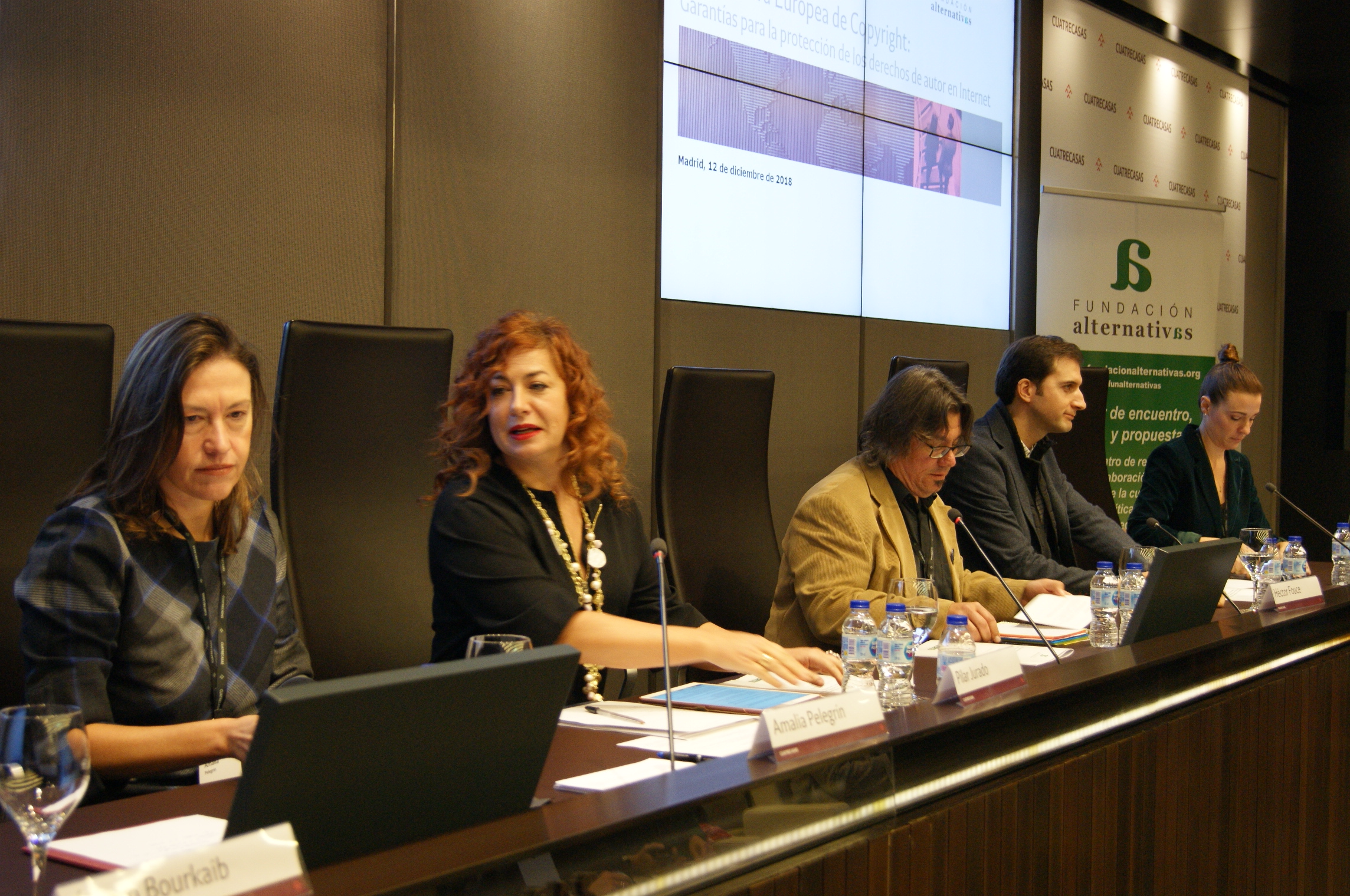 La Fundación Alternativas reunió en la sede de Cuatrecasas en Madrid a varios representantes de los distintos sectores implicados para analizar la situación y presentar argumentos a favor y en contra de la Directiva. Participaron en el coloquio Héctor Fouce, periodista y colaborador de la Fundación Alternativas; Pilar Jurado, miembro de la Junta Directiva de la SGAE; Adriana Moscoso del Prado, directora general de Industrias Culturales y Cooperación en el Ministerio de Cultura y Deporte; Ofelia Tejerina, miembro de la Junta Directiva de la Asociación de Internautas; Antonio Vargas, Public Policy Manager de Google; Diego López Garrido, vicepresidente de la Fundación Alternativas; y Amalia Pelegrín, responsable de política digital de Asociación Multisectorial de Empresas de Tecnologías de la Información, Comunicaciones y Electrónica (AMETIC).