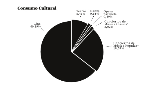 Un 54% de los españoles va al menos una vez al cine al año. Dentro de estos espectadores, un 9,9% de los españoles es asiduo (una vez a la semana), un 51,2% es regular (una vez al mes) y un 38,8% es ocasional.