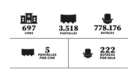 Según el último censo publicado por AIMC en mayo 2018, el panorama de la exhibición cinematográfica en España muestra que nuestro país cuenta con 697 cines y 3.518 pantallas. La densidad existente en España es de 76 pantallas por cada millón de habitantes.
