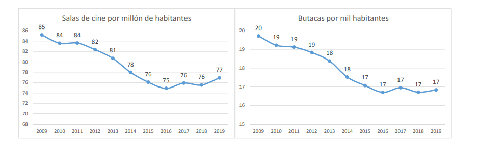 AIMC también estudia la densidad existente e informa de que hay aproximadamente 77 salas de cine por cada millón de habitantes, es decir, una más que en el censo anterior pero 8 menos que hace diez años.