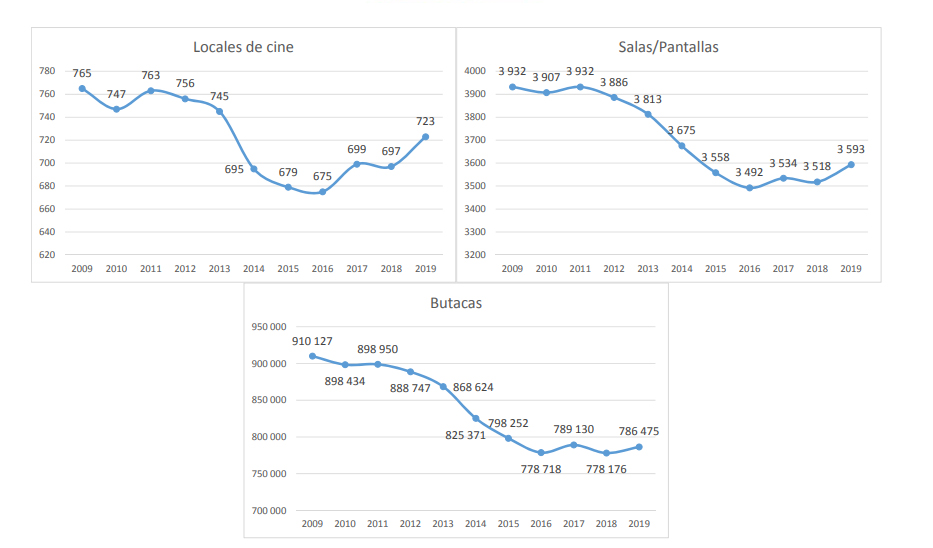 El número de locales de exhibición aumenta en 25 complejos, situándose en 723 (+3,7%). Asimismo, se incrementa el número de salas/pantallas respecto al año anterior, concretamente un +2,1%, pasando de 3.518 a 3.593 (con 128 altas y 53 bajas).