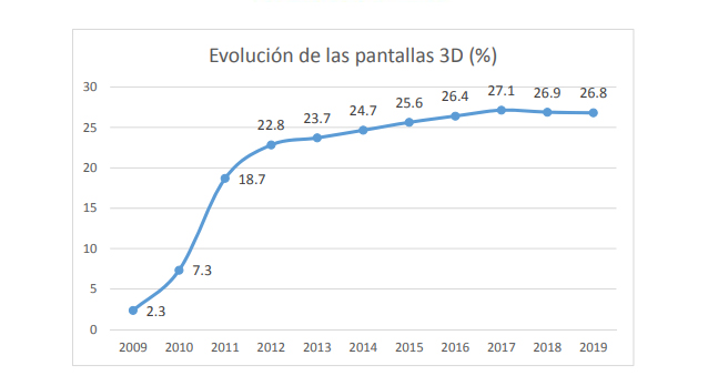 Existen 963 salas en España con capacidad para proyectar en 3D, lo que representa el 26,8% del total. Es prácticamente el mismo porcentaje (-0,1 puntos en un año) que en el año anterior. La estabilidad actual en este apartado se inició en 2012 (sólo +76 pantallas 3D y +4,0 puntos en siete años) y aproximadamente la mitad de los locales (356, un 49,2%) tienen, por lo menos, una sala 3D en sus instalaciones.