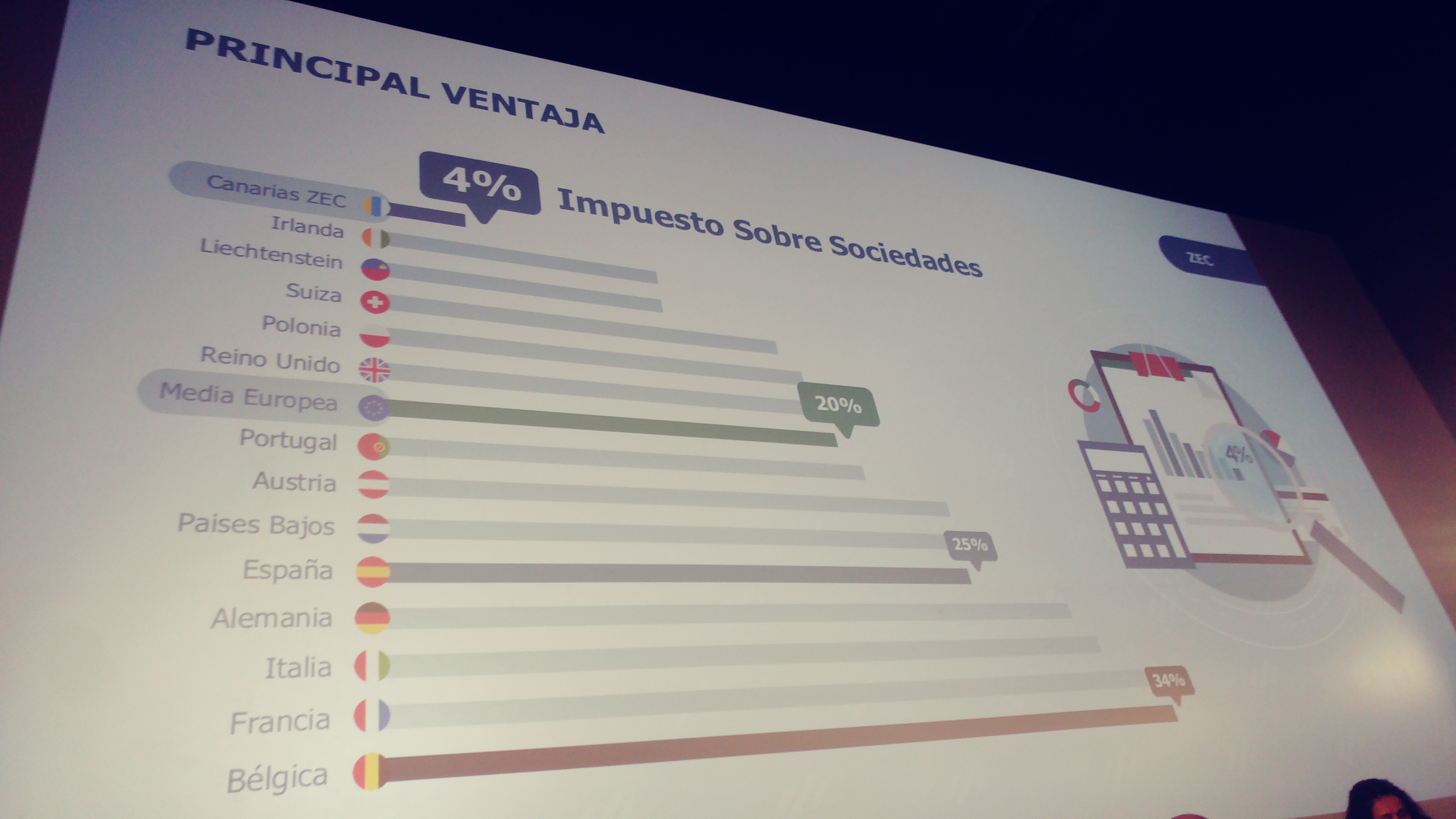 Cuando se decide trabajar en Canarias, aparte de las deducciones, hay muchos instrumentos fiscales combinables que permiten optimizar las inversiones. «El incentivo fiscal fundamental en la Zona Especial Canaria es la tributación de un 4% en el Impuesto de Sociedades. No hay otro territorio en Europa donde se pueda tributar tan poco», manifestó la presentante de la ZEC.