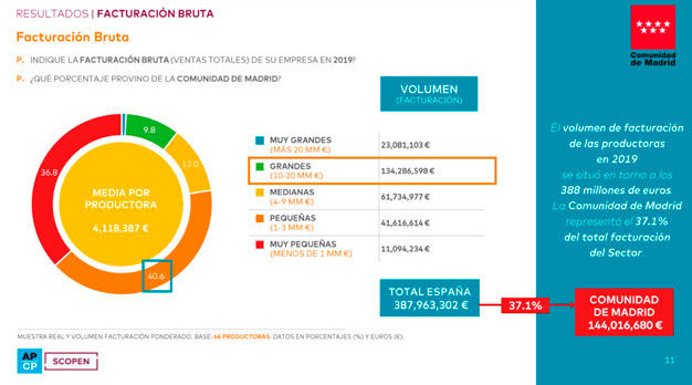 El volumen de facturación de las productoras, en 2019 -último año natural cerrado por las productoras-, este fue de aproximadamente 388 millones de euros, de los que el 37,1 por ciento corresponden a la Comunidad de Madrid. El reparto de estos 388 millones de euros, en función del tamaño de las productoras, fue de algo más de 23 millones para las muy grandes empresas; 134, 2millones para las grandes; 61,7 millones para las medianas, 41,6 para las pequeñas y algo más de 11 millones para las muy pequeñas.