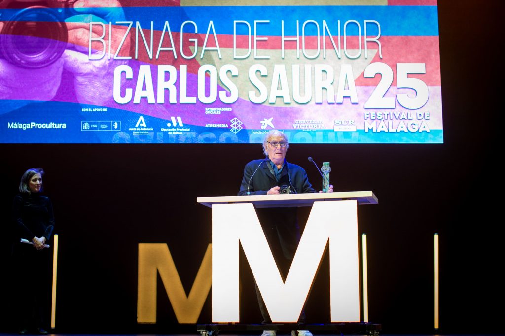 Y para ponerle la guinda al domingo, nada mejor que entregar a Carlos Saura la Biznaga de Honor del Festival. En un Teatro Cervantes repleto que se dejó las manos aplaudiendo, la realizadora Carla Simón leyó una serie de testimonios de creadores que tienen en Saura a un maestro para agradecerle su herencia. El director subió al escenario a recoger su biznaga cámara de fotos en mano y así inmortalizó un momento inolvidable.