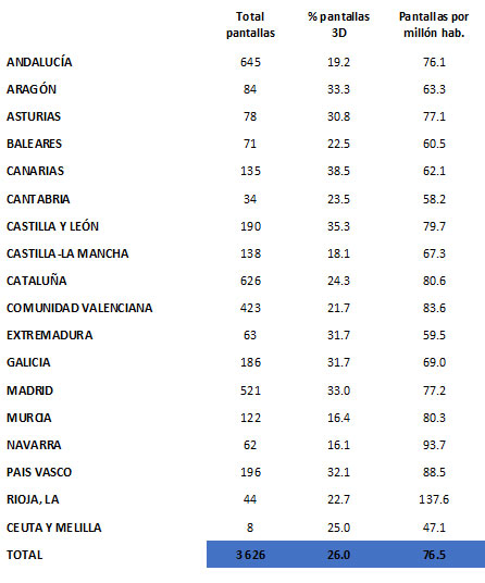 En España, existen aproximadamente 77 salas de cine por cada millón de habitantes, dos más que en la anterior entrega del censo, aunque 5 inferior a la cifra de hace diez años. Las comunidades que tienen 80 o más salas por millón de habitantes son: La Rioja (138), Navarra (94), País Vasco (89), Comunidad Valenciana (84), Cataluña (81) y Murcia (80). En cuanto a las provincias con mayor densidad de salas son, por este orden, Soria, La Rioja, Segovia, Tarragona, Girona, Salamanca y Cádiz, que superan las 100 salas por millón de habitantes.