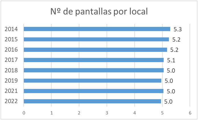 Un 55,1% de los locales (es decir, un total de 403), cuentan con más de una sala/pantalla, apreciándose descensos de 1,3 puntos en comparación con 2021 y de 4,8 puntos respecto a 2014. Otro dato relevante es que prácticamente la mitad de las salas/pantallas (48,8%) se encuentran en locales de 10 o más salas, y una de cada cuatro (25,8%) en locales de 7 a 9 pantallas.