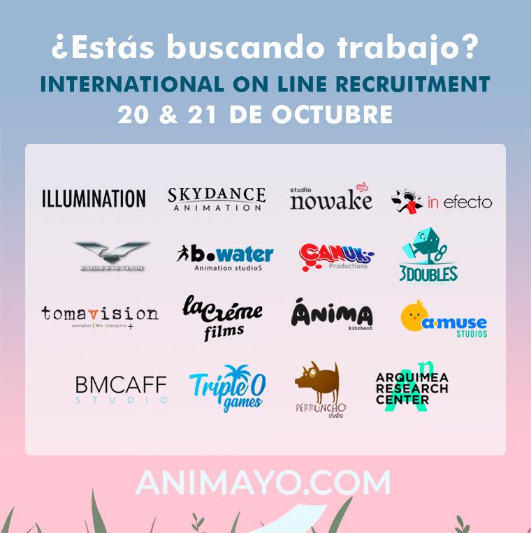 Animayo – Summit, Conferences and International Film Festival of Animation organiza el denominado ‘International On Line Recruitment by Animayo’, unas jornadas que se celebran los días 20 y 21 de octubre y que fomentan la empleabilidad, tanto de nuevos talentos como de profesionales, con ofertas de trabajo internacionales de 18 empresas que demandan más de 60 perfiles profesionales. Se prevén más de 300 reuniones online en esta feria internacional de trabajo sin salir de casa.
