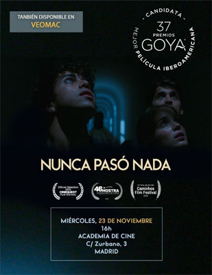 Nunca pasó nada, opera prima de Gonçalo Galvão Teles, es candidata a los 37 Premios Goya de la Academia de Cine en la categoría de mejor película iberoamericana. La producción de Fado Films será protagonista mañana en la institución, a las 16:00 horas, para mostrar a los académicos el tema de la adolescencia y el suicidio, un problema urgente y de gran preocupación hoy en día en nuestra sociedad.