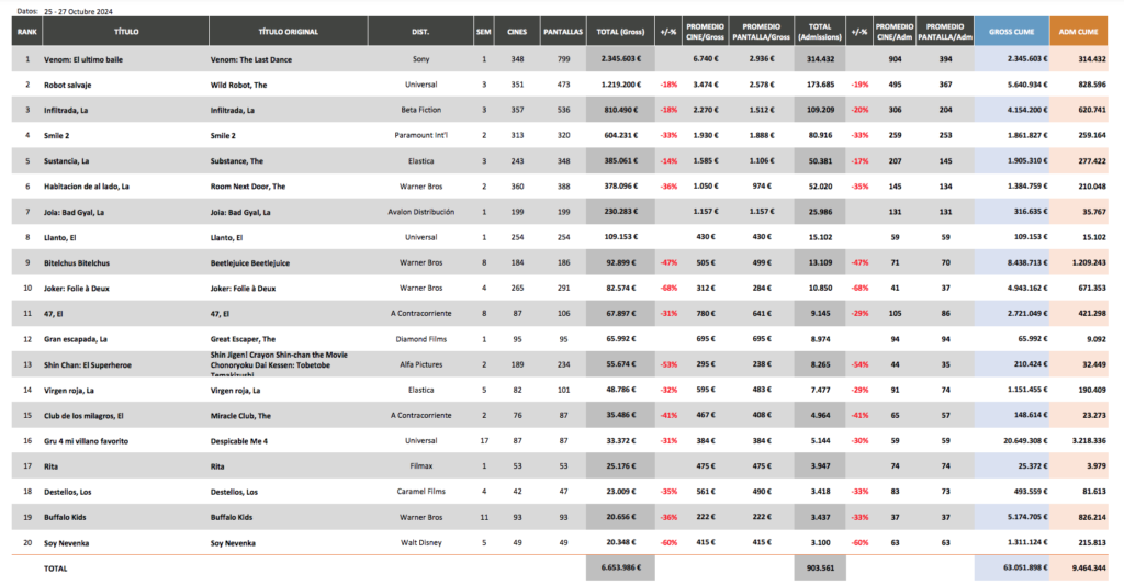 Parece que la ola de frío de este pasado fin de semana ha impulsado a los españoles a refugiarse en las salas de cine. Sentados en las butacas, los espectadores han podido disfrutar de la calefacción y del estreno de Venom: El último baile, que pone punto y final a su franquicia y se hace con el número uno del ranking. A la historia de desenlace de Eddie Brock y el simbionte Venom le siguen la película de animación Robot Salvaje y el thriller español La infiltrada. Entre los tres films, más todas las otras películas en cartelera, la recaudación de este pasado fin de semana sube a la maravillosa cifra de 6.653.986€, más de un millón más que el pasado weekend.