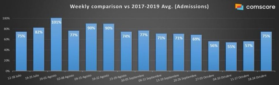 Para concluir, os dejamos también con el gráfico de Comscore que muestra la evolución semanal de la taquilla comparada con la media del mismo periodo comprendido entre 2017 y 2019.