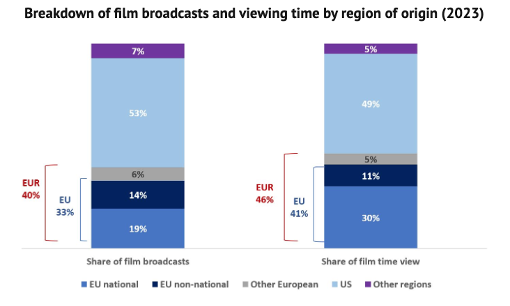 Según un informe del Observatorio Audiovisual Europeo titulado “How Do European Films Perform on TV?”, que analiza datos de 2023 de 141 cadenas de televisión en 18 países de la UE: