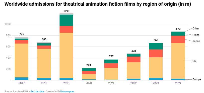 - Sin embargo, esto no se ha cumplido para las películas de animación europeas, que vendieron en promedio 33 millones de entradas por año entre 2022 y 2024, frente a un promedio de 42 millones antes de la pandemia.