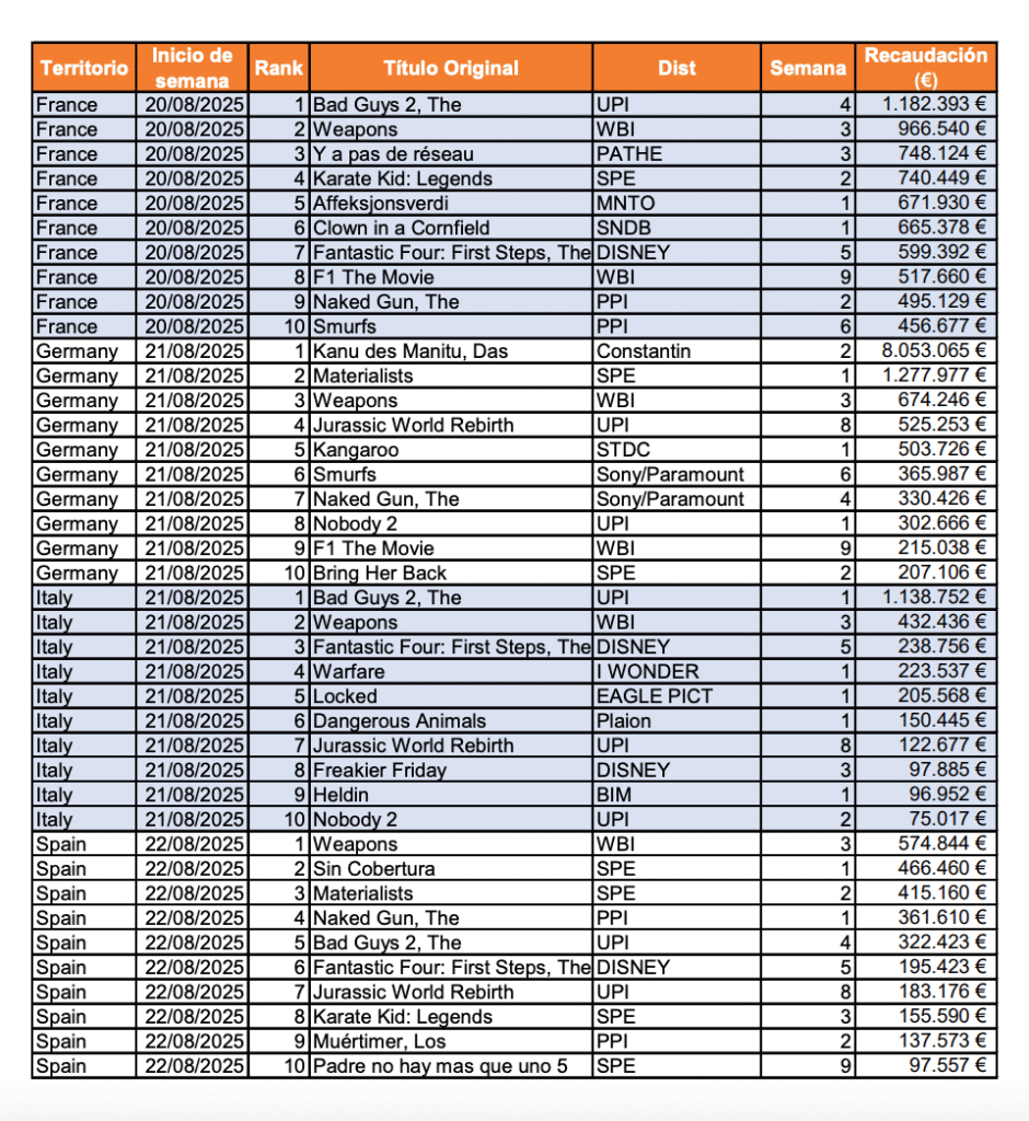 Aquí sí hubo un título que no solo superó los 2 millones, sino que los multiplicó por cuatro: Das Kanu des Manitu arrasó y se consolidó como el fenómeno local de este fin de semana. Alemania ha sido, sin duda, el mercado más vibrante de Europa.