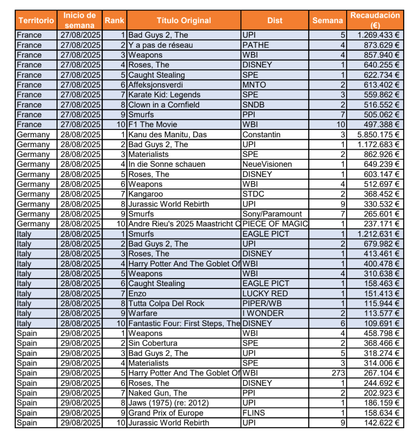 Cierre de agosto marcado por dos fuerzas contrapuestas: por un lado, el músculo del cine local (Alemania registra un fenómeno que distorsiona la foto europea); por otro, títulos internacionales que mantienen recorrido simultáneo en varios territorios (especialmente The Bad Guys 2 y Weapons). El resultado es una cartelera que combina event-cinema y reestrenos veraniegos, con pocos huecos para sorpresas europeas pequeñas fuera de nichos.