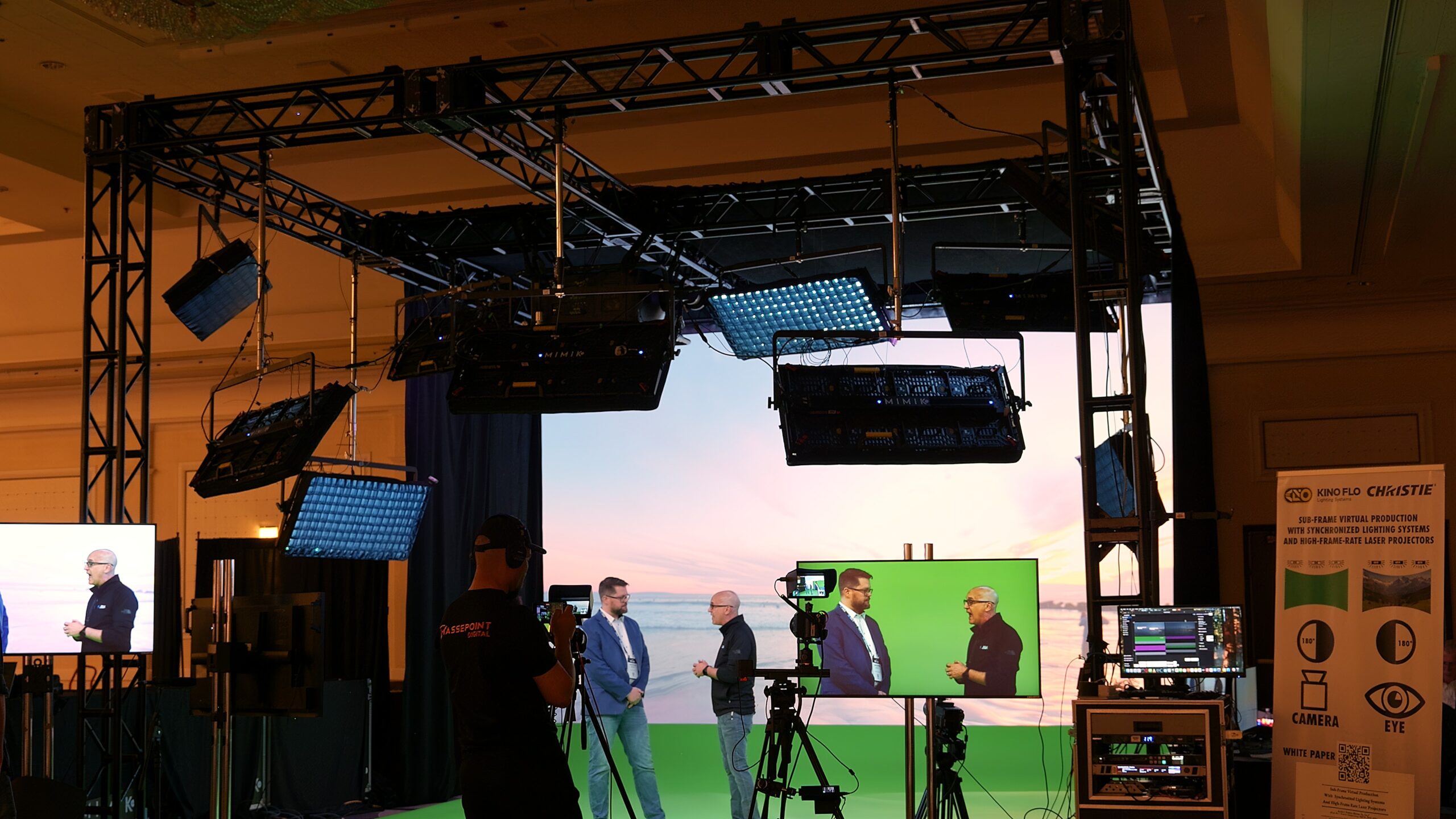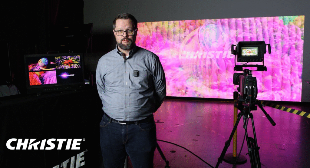 Durante el panel, Chris Barnett (Christie), Frieder Hochheim (KinoFlo), Loren Simons (RED) y el director y podcaster Peter Frelick expusieron las piezas del rompecabezas: proyección de alto brillo y contraste, cámaras con obturador global y altas tasas de cuadro, y un diseño de sistema que sincroniza iluminación, pantalla y cámara para habilitar el sub-framing. Este recurso técnico permite generar, dentro de un mismo fotograma, múltiples “realidades” de luz o salidas paralelas, como una captura final pixel y, al mismo tiempo, una señal de croma limpia.