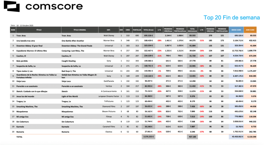 La líder del fin de semana es Tron: Ares, que se estrena con 695.526 € y 83.555 espectadores en 310 cines y 690 pantallas (2.244 € de media por sala). Dirigida por Joachim Rønning y protagonizada por Jared Leto, supone el regreso a la saga de ciencia ficción iniciada por Disney en los ochenta. Su debut queda lejos de los estándares de superproducción; un título de este calibre debería acercarse al millón en su arranque. El resultado refleja más curiosidad que entusiasmo, y una desconexión del público general con las secuelas visualmente ambiciosas pero sin narrativa diferencial.