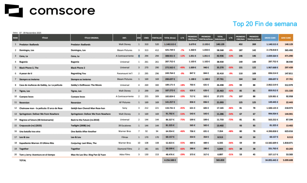 La taquilla española encadena otra semana de leve crecimiento (+7,3 %) pero sin romper la tendencia de fondo. Con 4,25 millones de euros, el mercado mejora respecto a los días previos a Halloween, aunque el impulso procede casi en exclusiva de Predator: Badlands, que acapara más de una cuarta parte del total. La asistencia sube, pero la estructura sigue igual, un único título sostiene la cartelera mientras el resto sobrevive con cifras ajustadas.