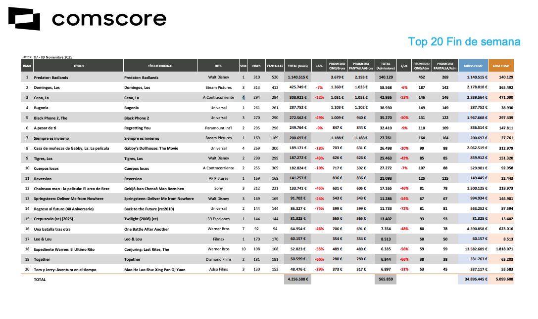 Además de Predator: Badlands y Bugonia, que lideran la cartelera, el fin de semana deja otros cuatro estrenos dentro de este top 20. Siempre es invierno, de David Trueba, debuta en séptimo lugar con 200.697 euros en 169 cines, una media de 1.188 euros por cine. Adaptación libre de su novela Blitz, presentada en la Seminci, confirma la buena conexión del director con el público adulto.