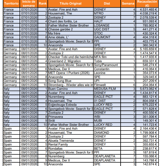 La semana ha estado dominada por los grandes títulos estadounidenses, que lideran la taquilla en la mayoría de los principales mercados europeos. Solo Italia rompe esta tendencia, donde una producción nacional logra imponerse en el primer puesto, confirmando un panorama desigual para el cine local según el territorio.