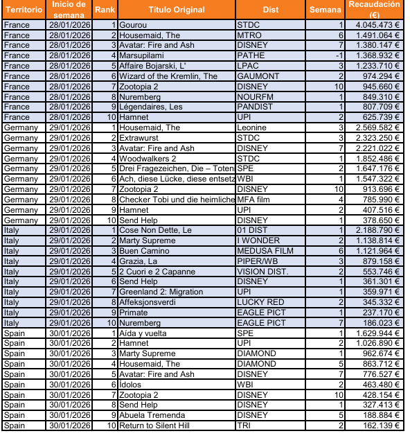 En conjunto, el mapa europeo de finales de enero de 2026 muestra una tendencia clara: el cine nacional recupera posiciones estratégicas en sus mercados domésticos, con Francia y Alemania liderando en fortaleza estructural, Italia consolidando su presencia y España demostrando capacidad de liderazgo puntual en un entorno altamente competitivo.