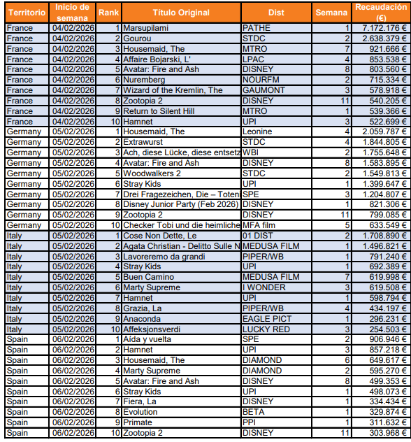 En Francia, como ya hemos mencionado, el top 1 ha sido para Marsupilami, distribuida por PATHE, que ha alcanzado una recaudación de 7.172.176 €. El ranking francés también ha contado con una destacada presencia local: Gourou, distribuida por STDC, se sitúa en el top 2 con 2.638.379 €, mientras que Affaire Bojarski, L’, de LPAC, ocupa el top 4 con 853.538 €. En total, tres producciones locales se posicionan dentro del top 5, consolidando el dominio del cine francés en su propio mercado.
